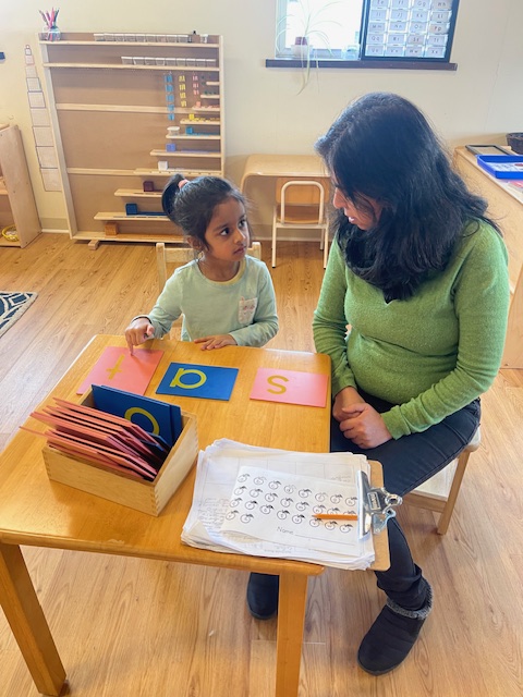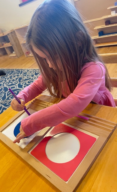 Language is explored phonetically in a Montessori classroom. Initial alphabet sounds are first introduced through the sandpaper letters and matching objects. The metal insets are an exercise used to refine pencil control and help to improve writing skills.